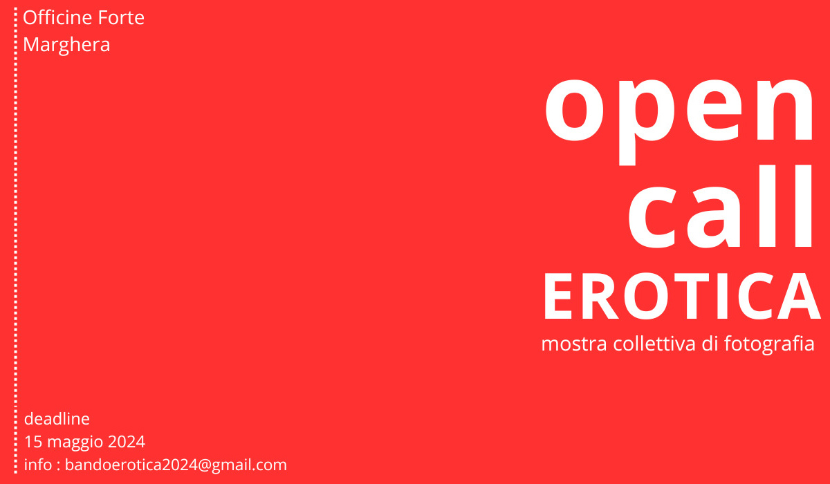 Call per la mostra “EROTICA” a luglio a Forte Marghera (Venezia), in concomitanza con gli eventi culturali della Biennale di Venezia. Da un’idea di Ivana Galli, Patrizio Cipollini, Simona Innocenti ed in collaborazione con Carlo Gallerati.